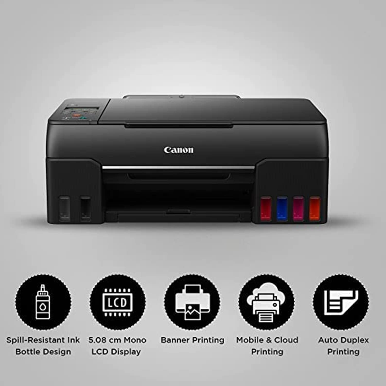 - Special Features: High quality photo printer; Ideal Usage : Home, Photo lab and Photo Studio ; Included Components: Printer, Power Cord, USB cable, Instruction Manual, 1 set of GI 73 Cyan, Magenta, Yellow, Red, Grey and Black ink bottles